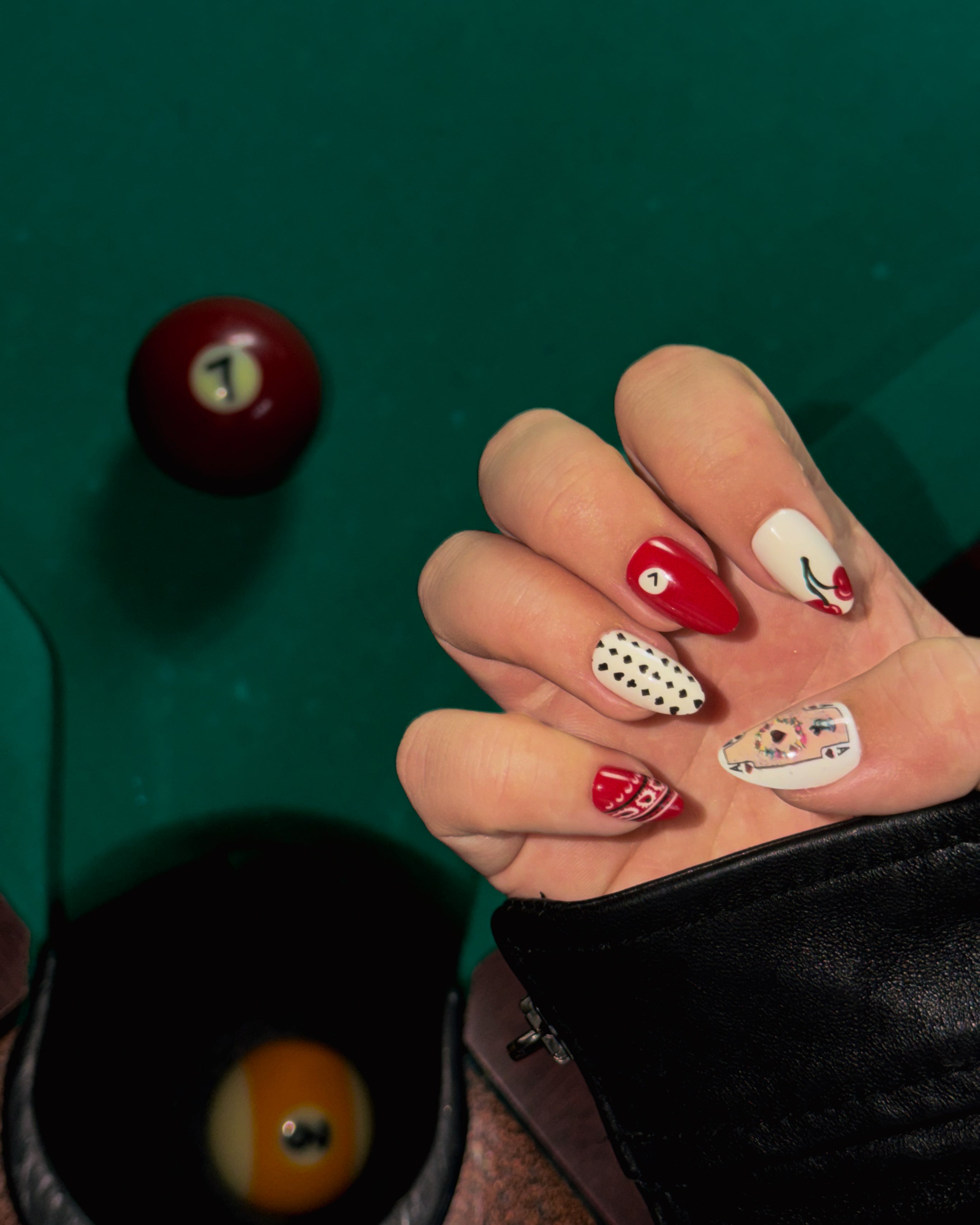 Unleash your inner risk-taker with our Clyde nails. Feel lucky with vibrant red vibes and pool hall charm. Let your nails be your ultimate adventure!
