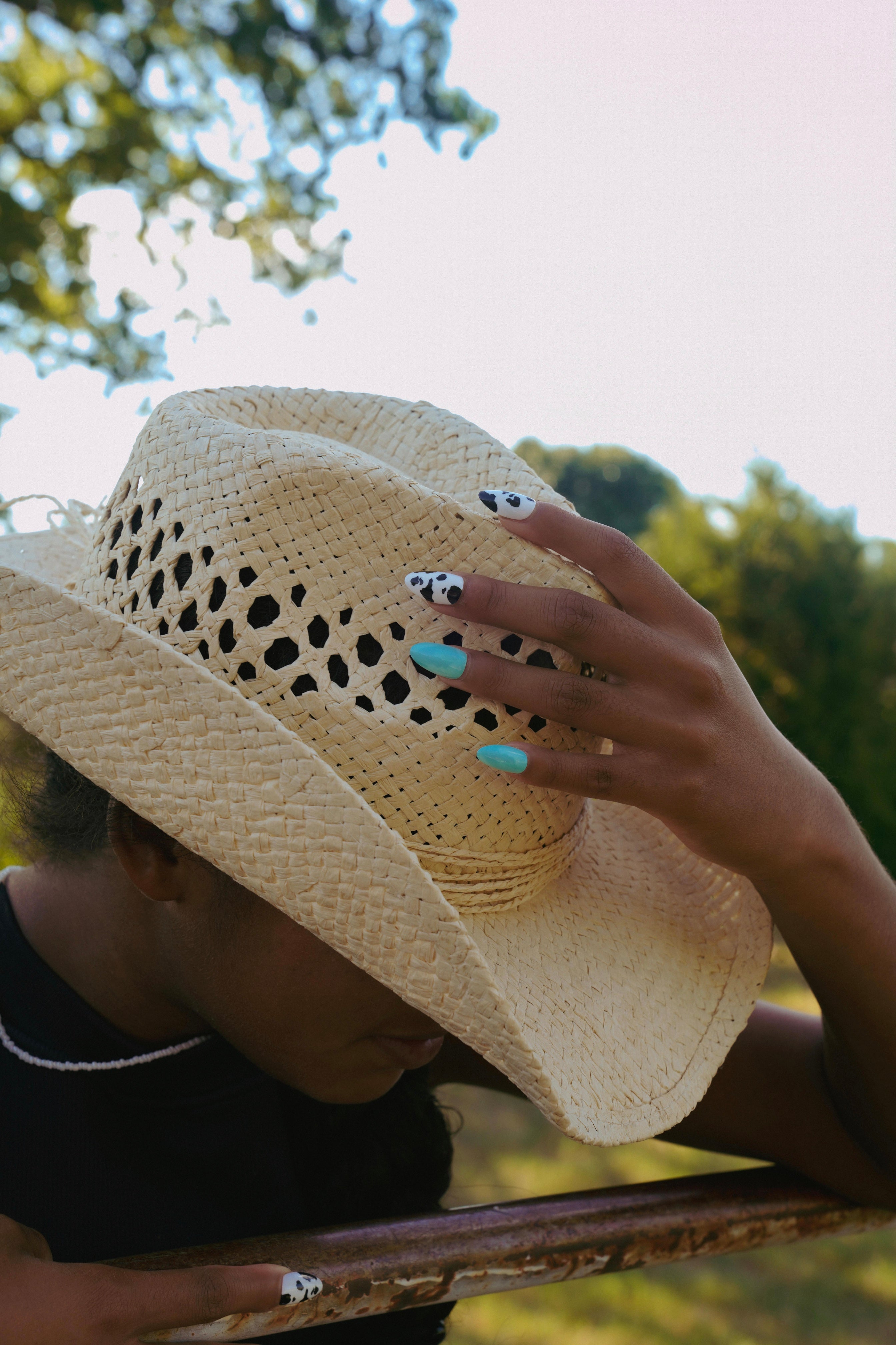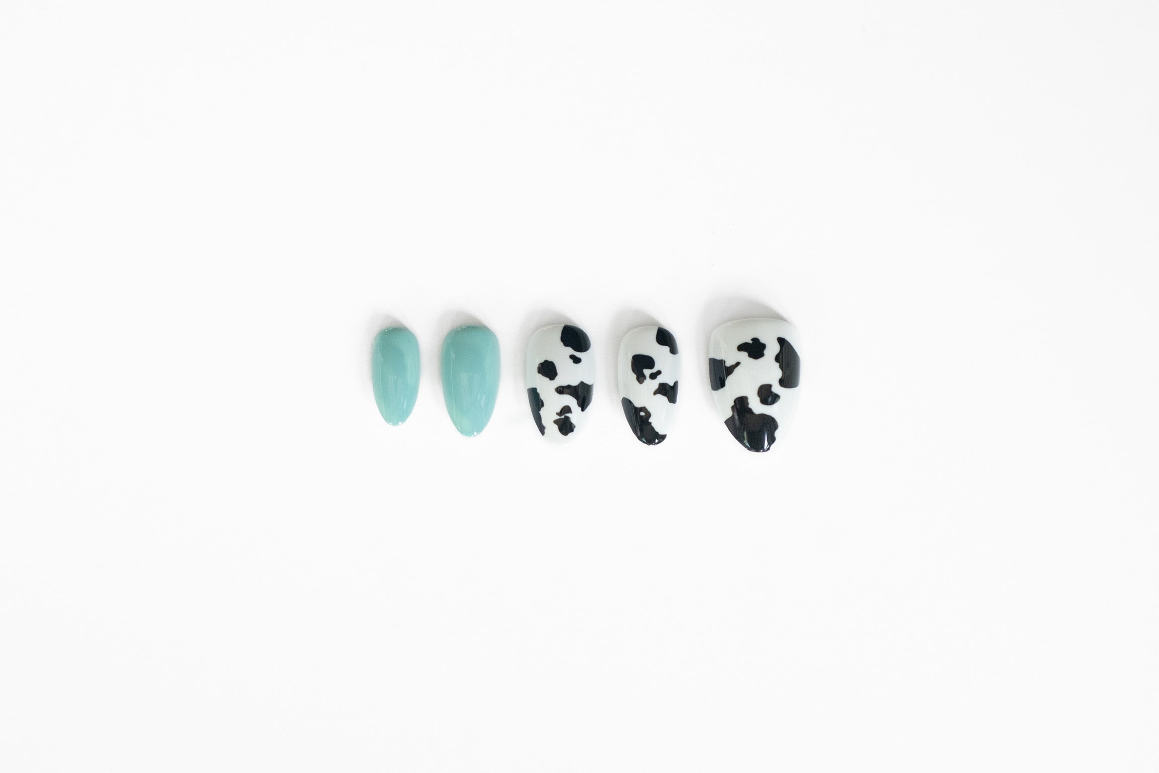 Nail your Western look with our Frank nails. the playful turquoise cow print nails that add a pop of color to any outfit. Perfect for those who want to stand out from the herd.